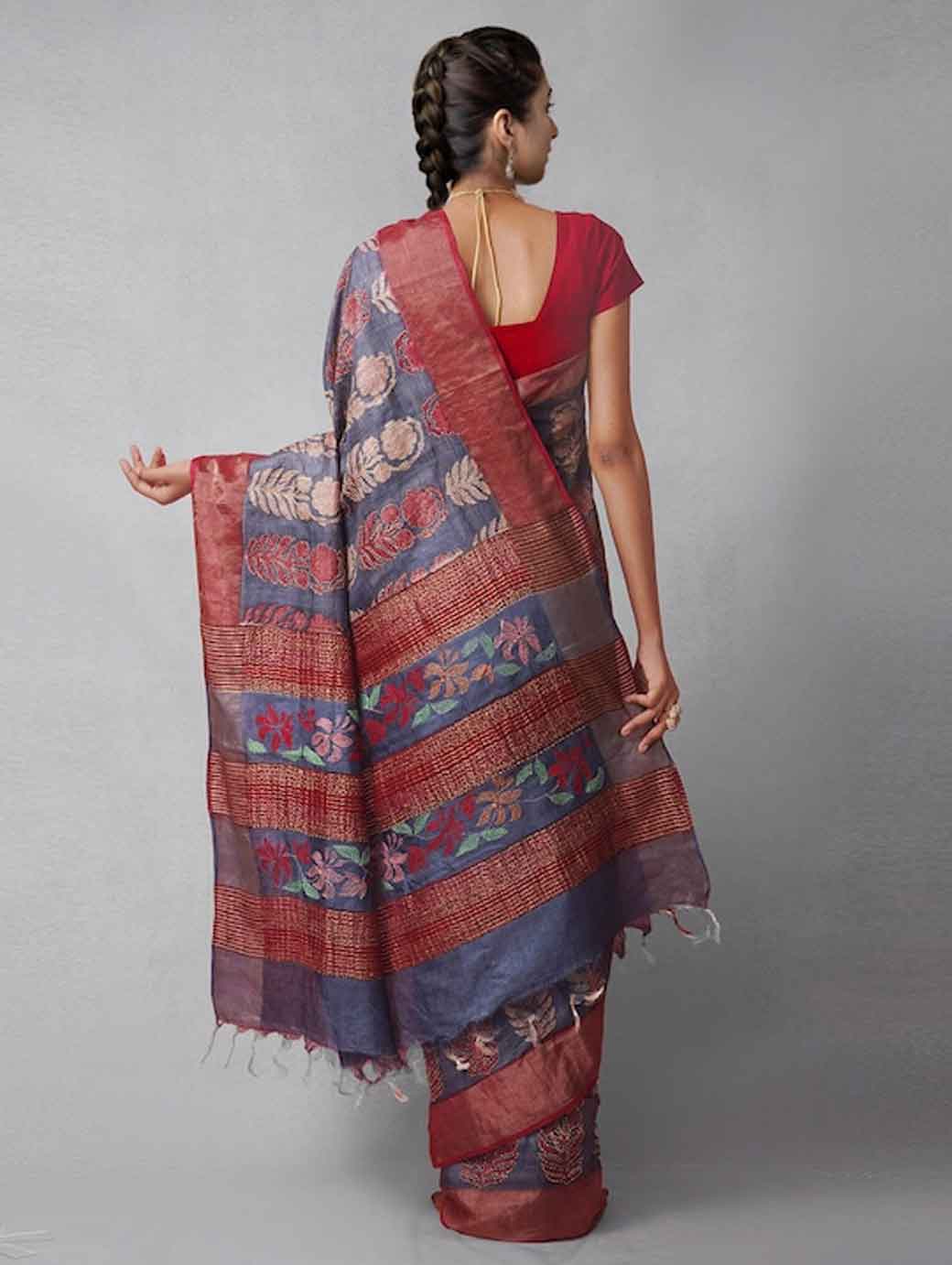 Maroon & Blue Woven Design Kantha Work Pure Silk Tussar Saree
