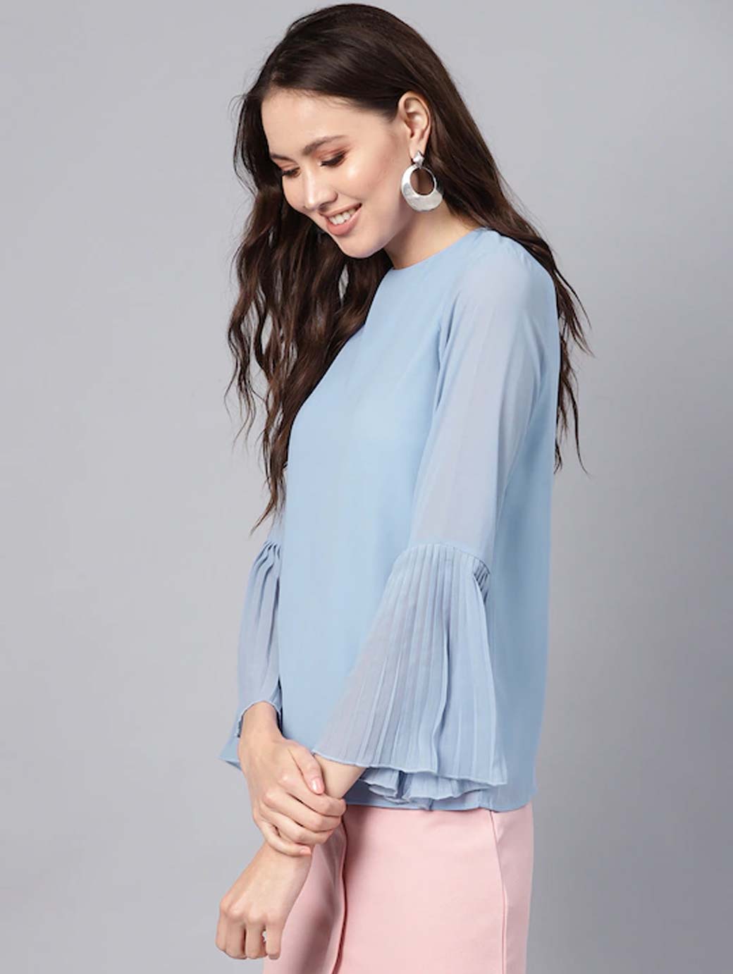 Blue Pleated Top With Frilled Hem