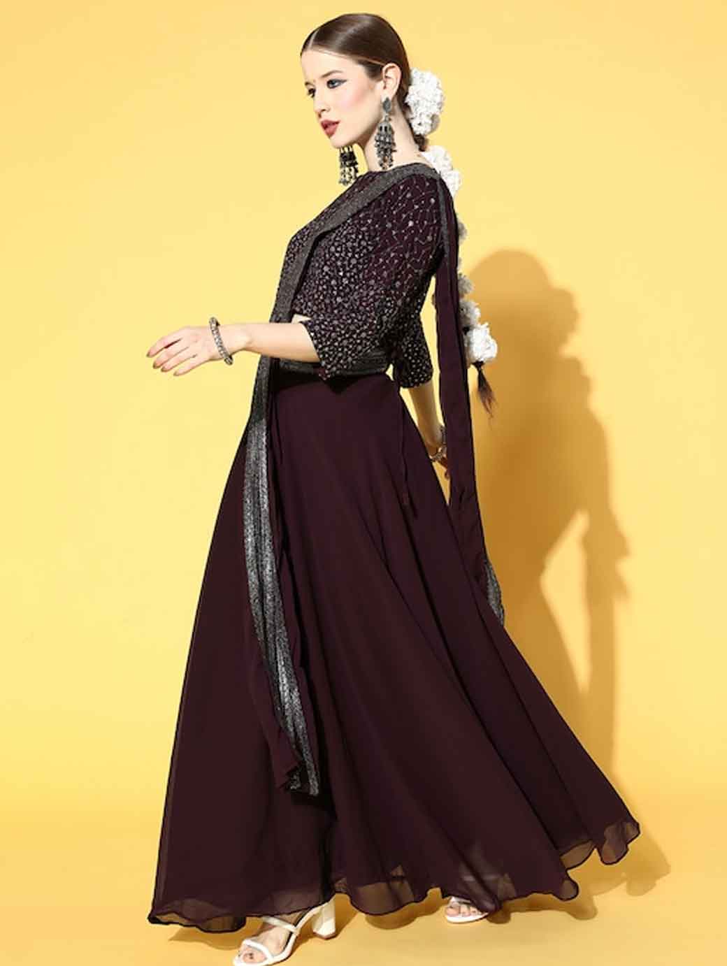 Take your traditional look to the next level with this elegant lehenga choli. It includes an enchanting boat neck and flared bottom to complete your look.