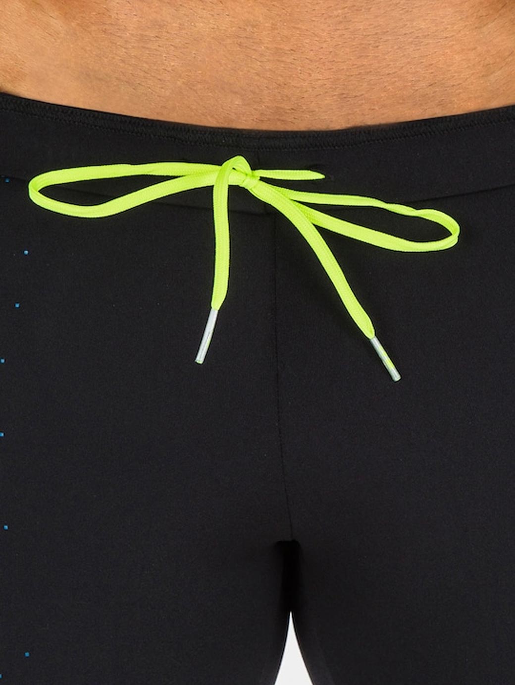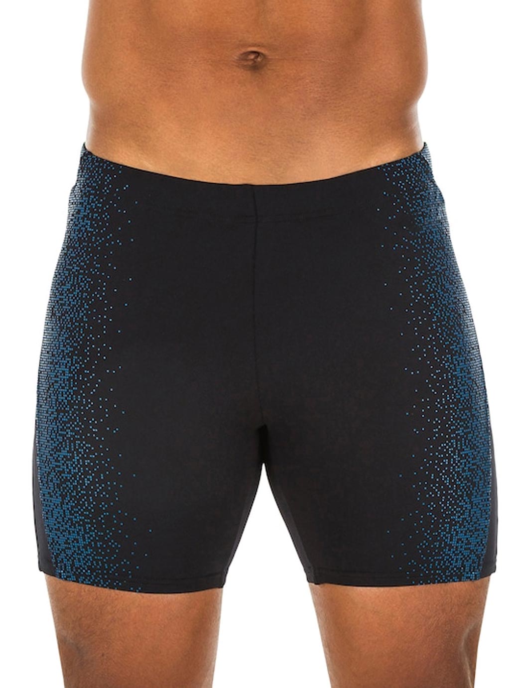A pair of black and blue printed mid-rise boxer shorts, has an elasticated waistband with a slip-on closure